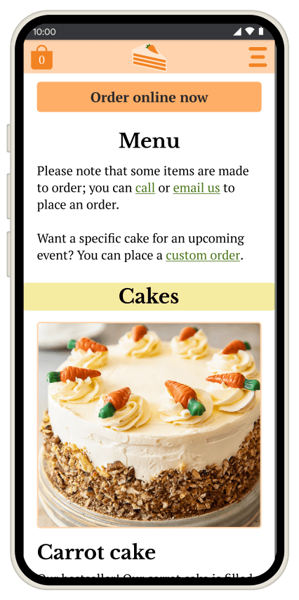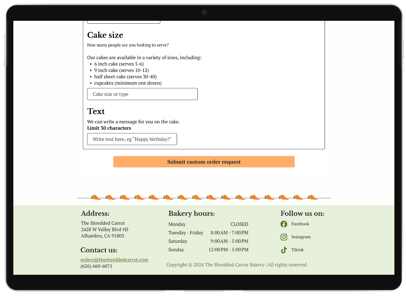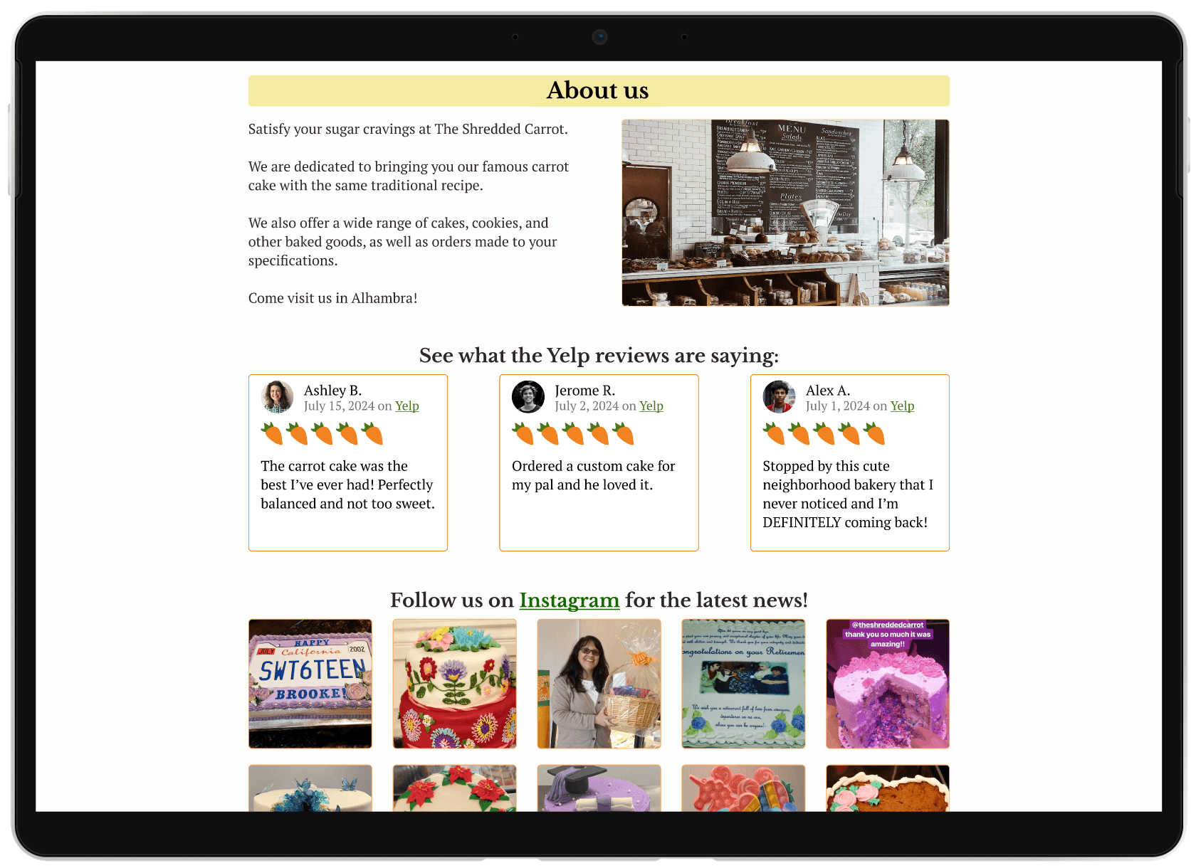 Early 2024 – The Shredded Carrot (TSC) is a bakery that recently changed ownership. The new owner wants to update and refresh the bakery’s image and online presence to attract more customers, while staying true to the original cozy and welcoming atmosphere.